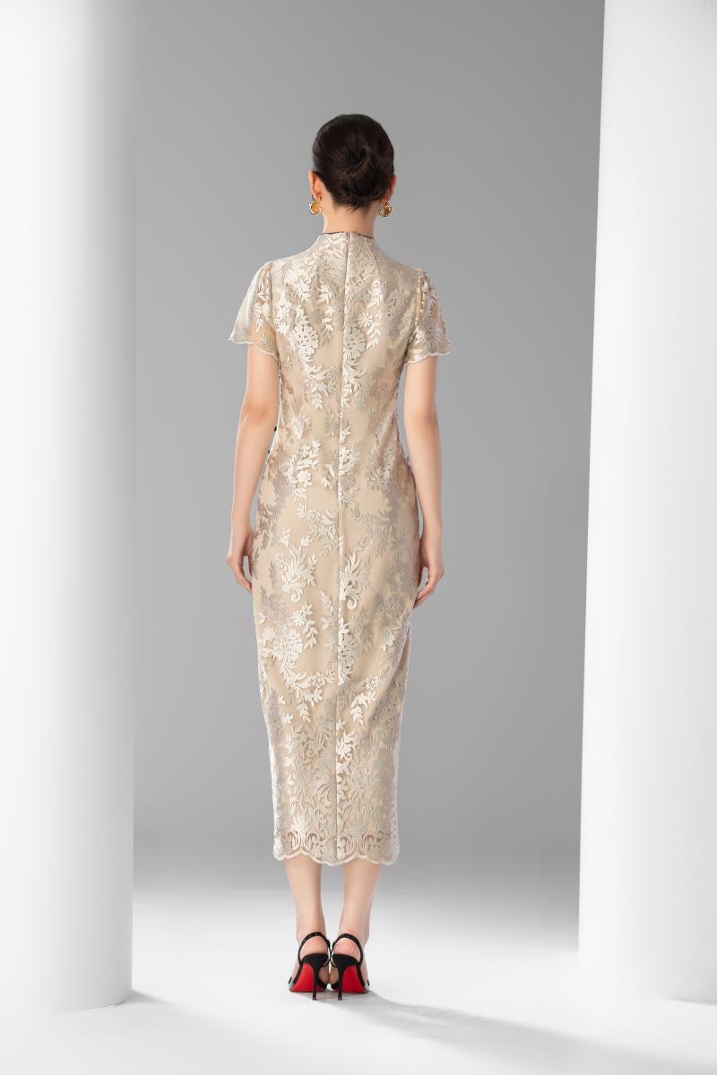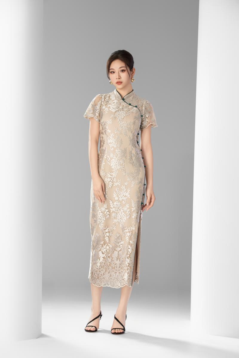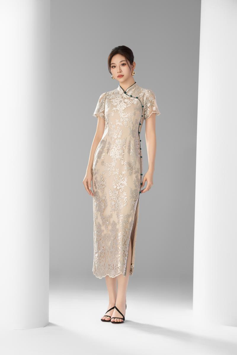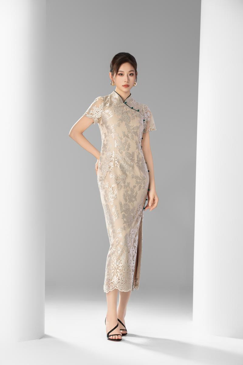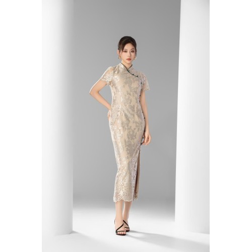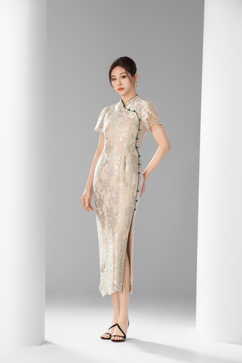 黛青盘扣蕾丝旗袍